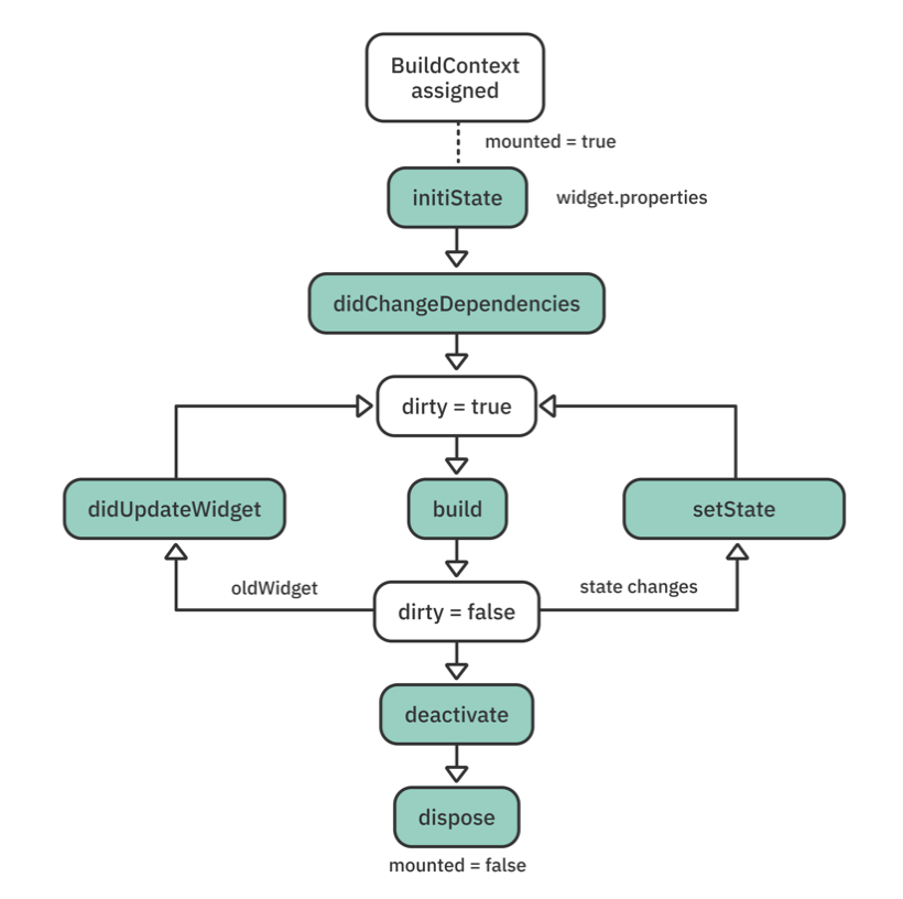 - didUpdateWidget() 在组件状态发生变化时调用。一般情况下,父 Widget 调用 setState() 后,子 Widget 就会调用 didUpdateWidget() 方法。